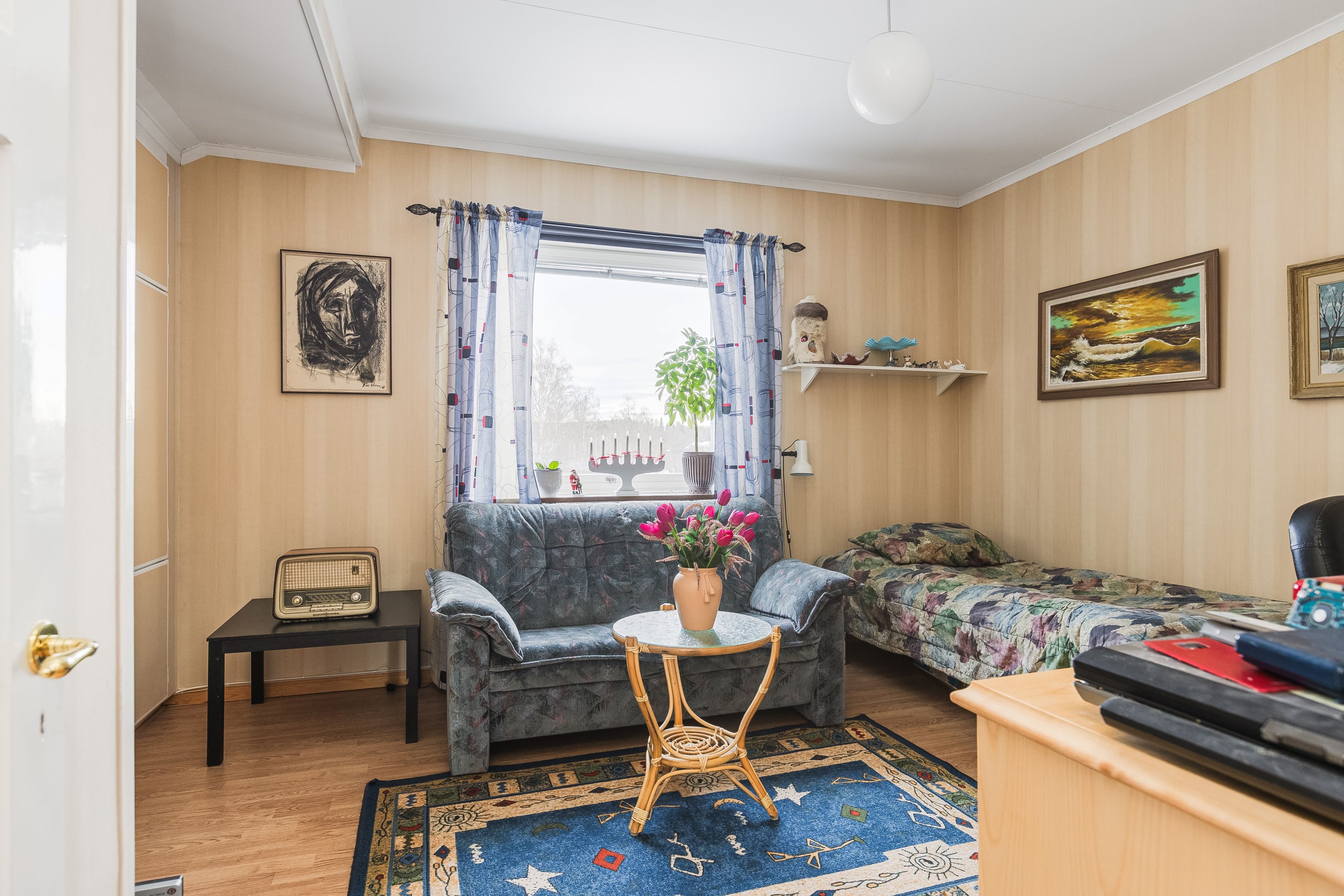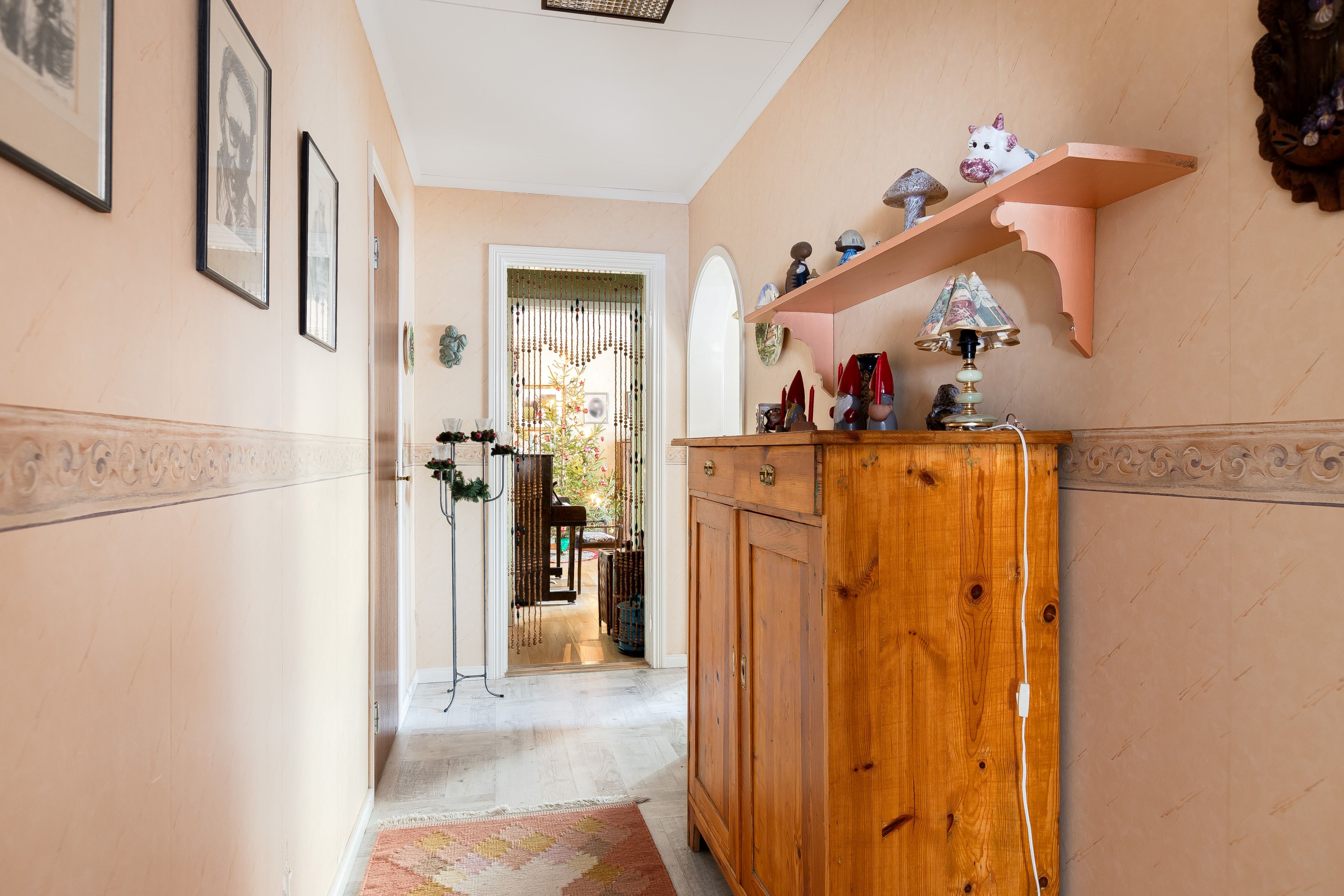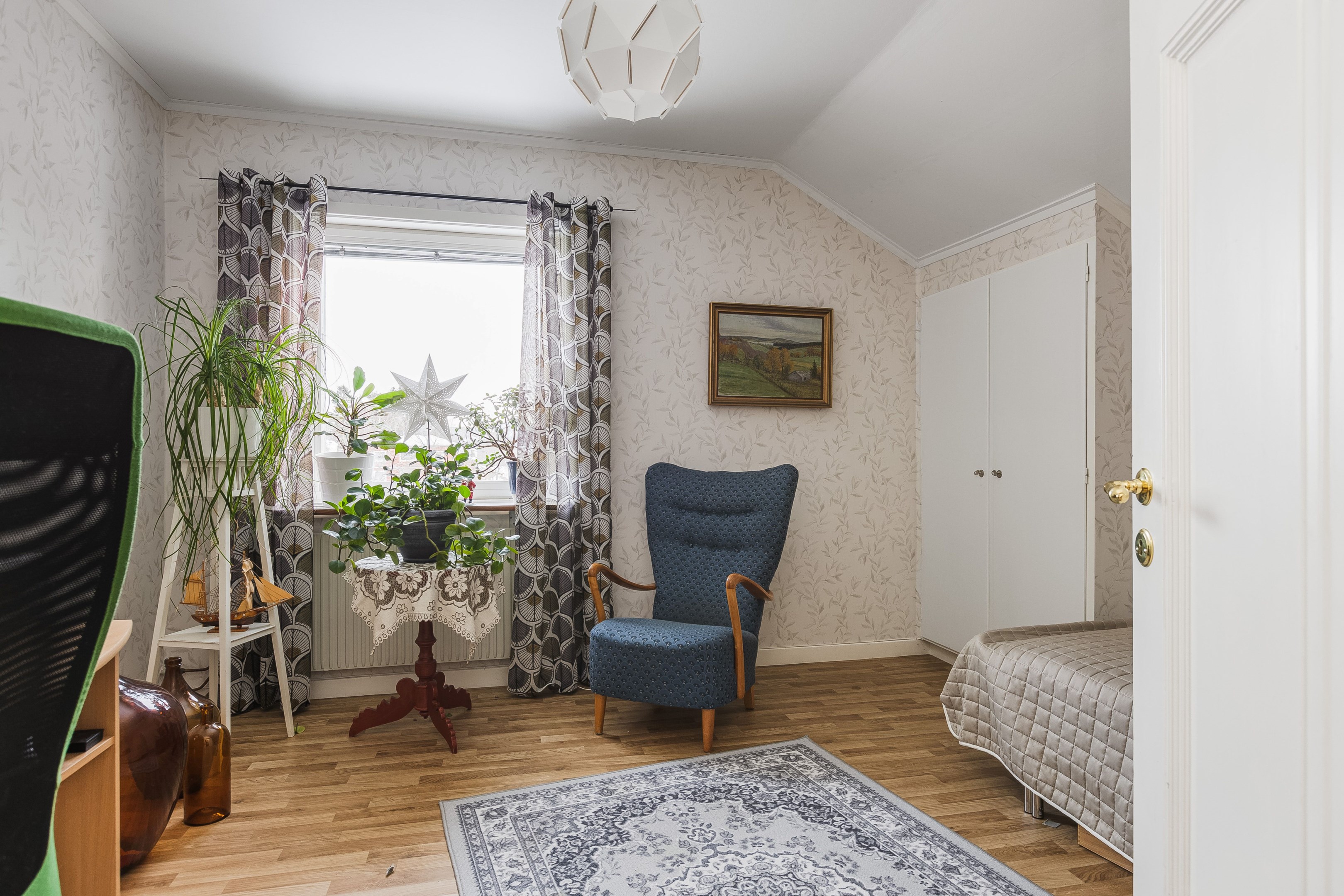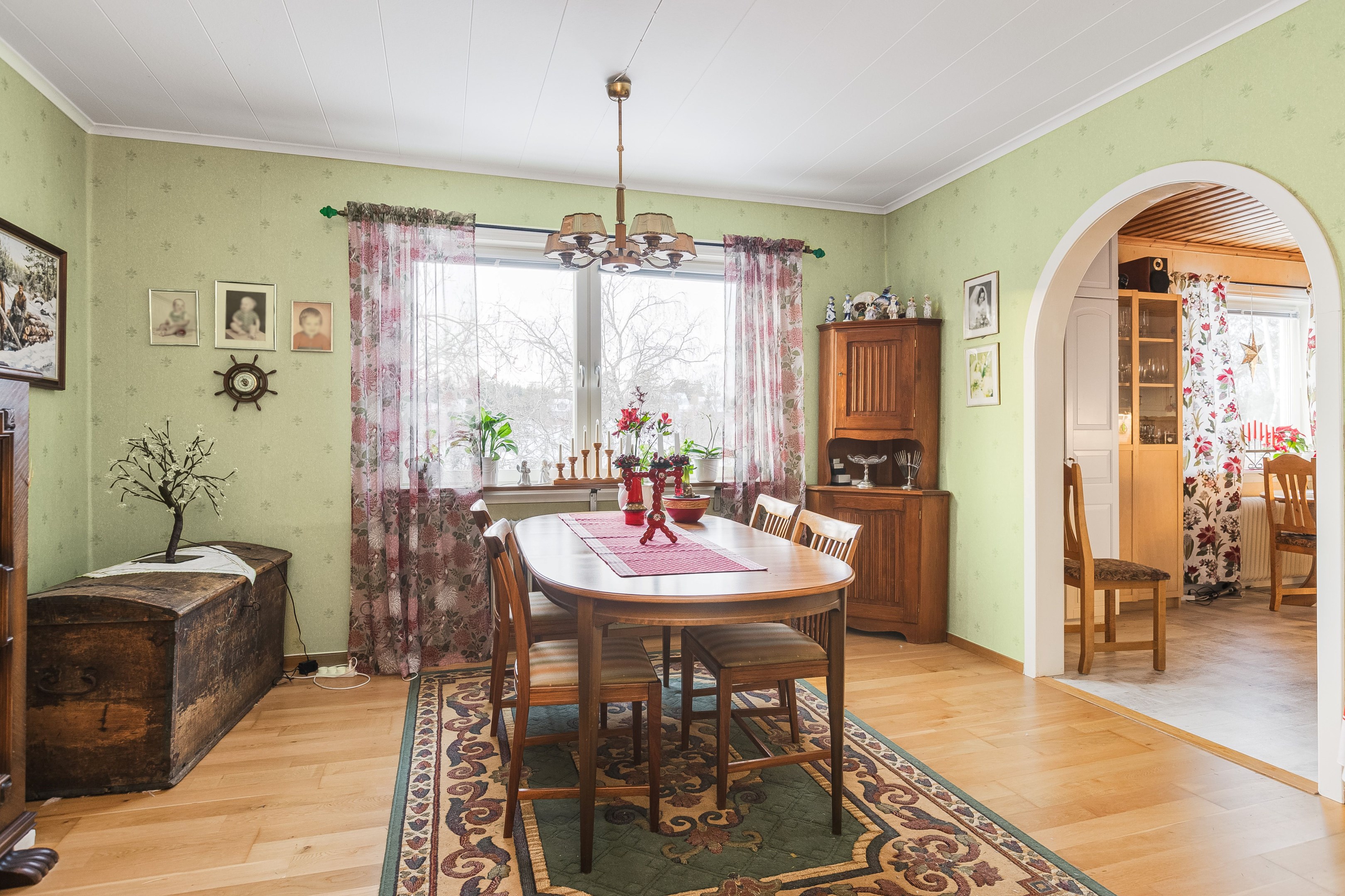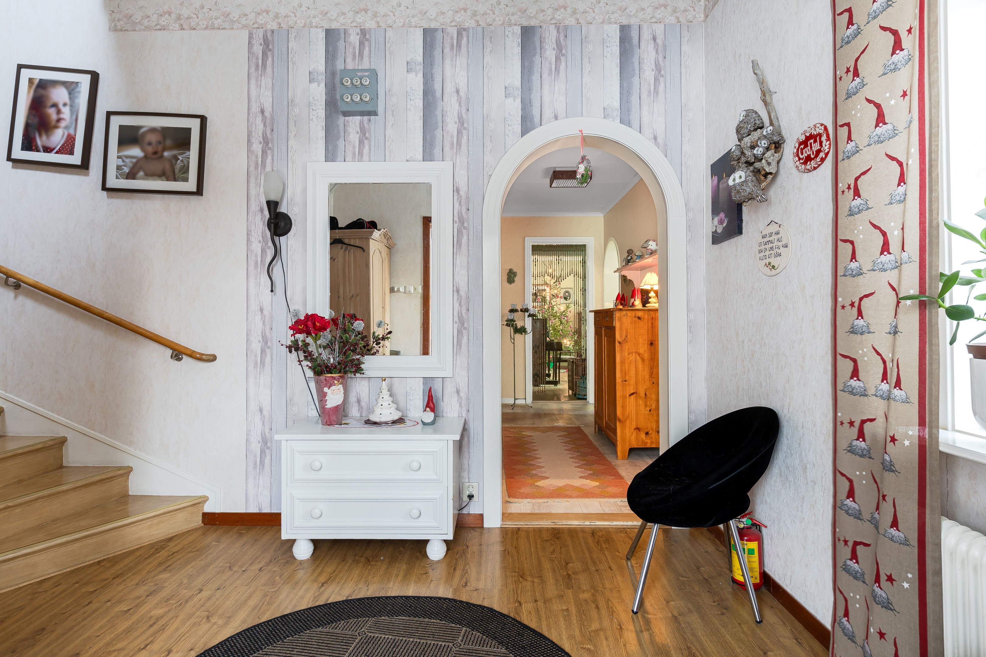 Välkommen in i den rymliga hallen! Härifrån tar vi oss vidare in i huset och till höger finner vi köket som har god yta för matlagning samt plats för matbord. Intill köket ligger även ett rum som med fördel kan användas för de större middagarna. innanför matsalen finns även ett rum till som kan användas som sovrum eller kotor. Från husets hall kommer man även upp till övervåningen där vi förutom vardagsrum även finner sovrum samt badrum/tvättstuga. husets kälare når man från utsidan, har nere finns förutom bergvärmen plats för förvaring. I husets bottenvåning finns även en lägenhet som i dagsläget hyrs ut. Ett bra sätt för att få ner driftkostnaderna på sitt boende! Marken ruunt huset består av gräsyta samt träd. Här finns även ett uthus med god plats till förvaring samt ett lusthus för kaffe i sommarvärmen! Varmt välkommen på visning!
