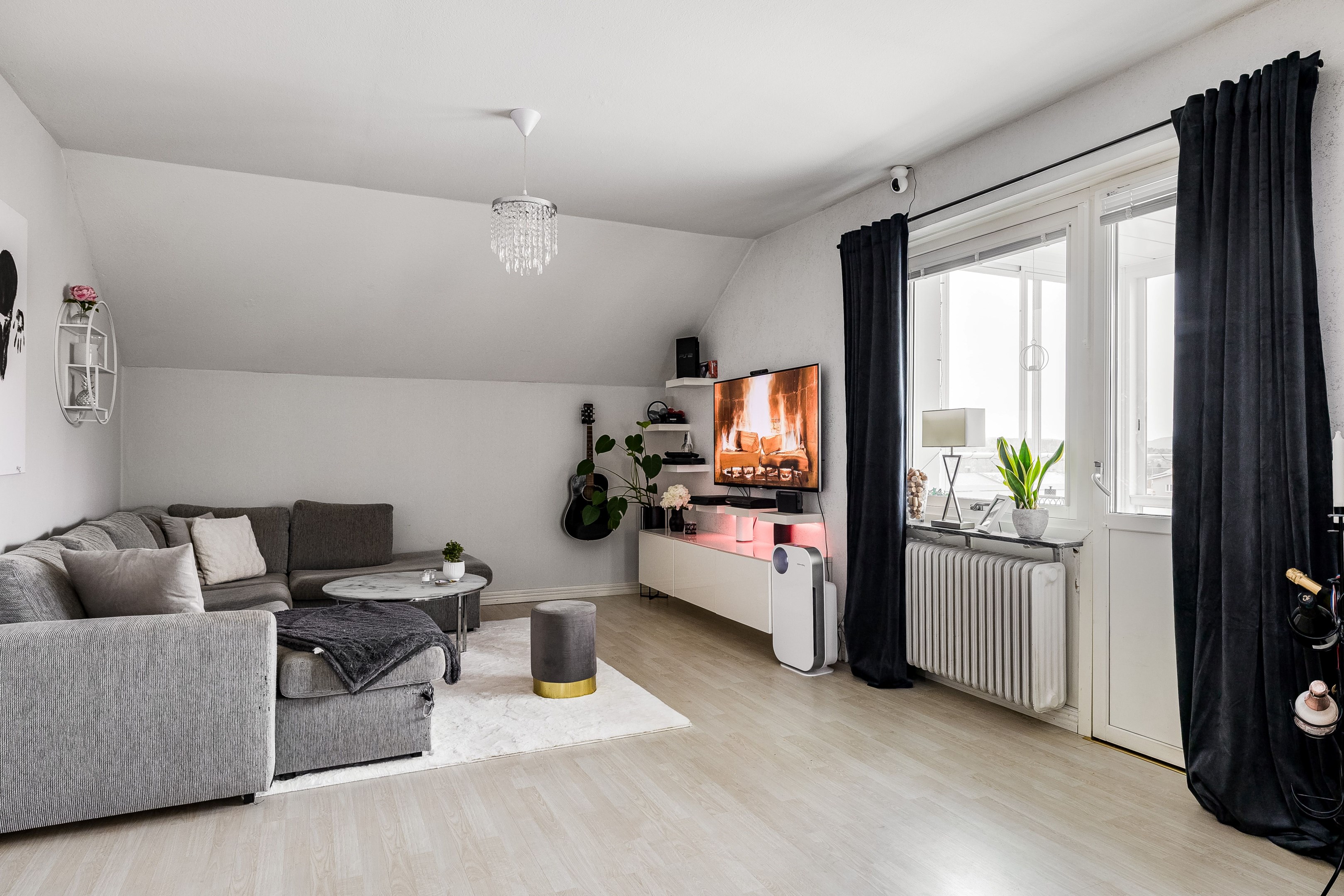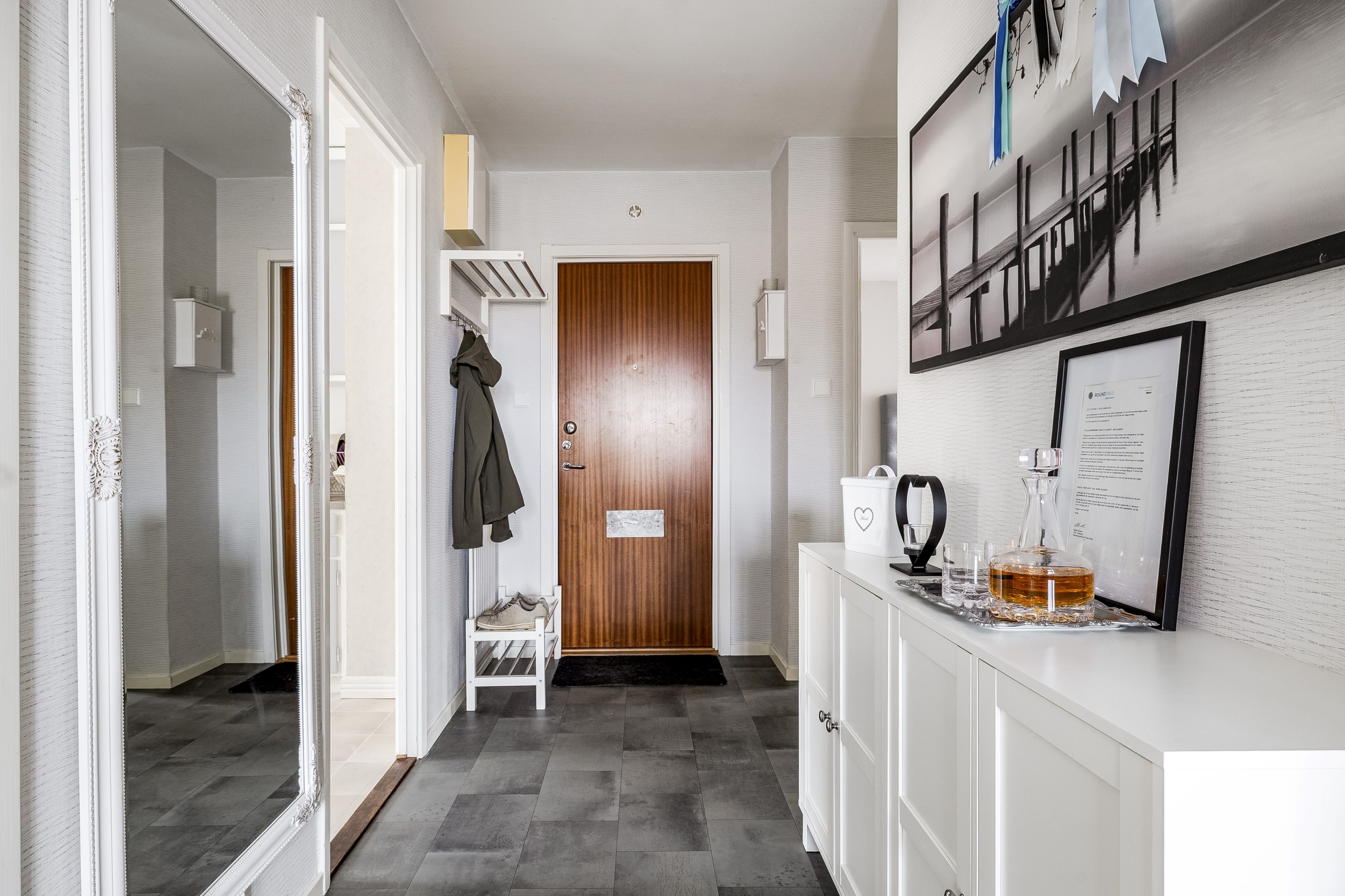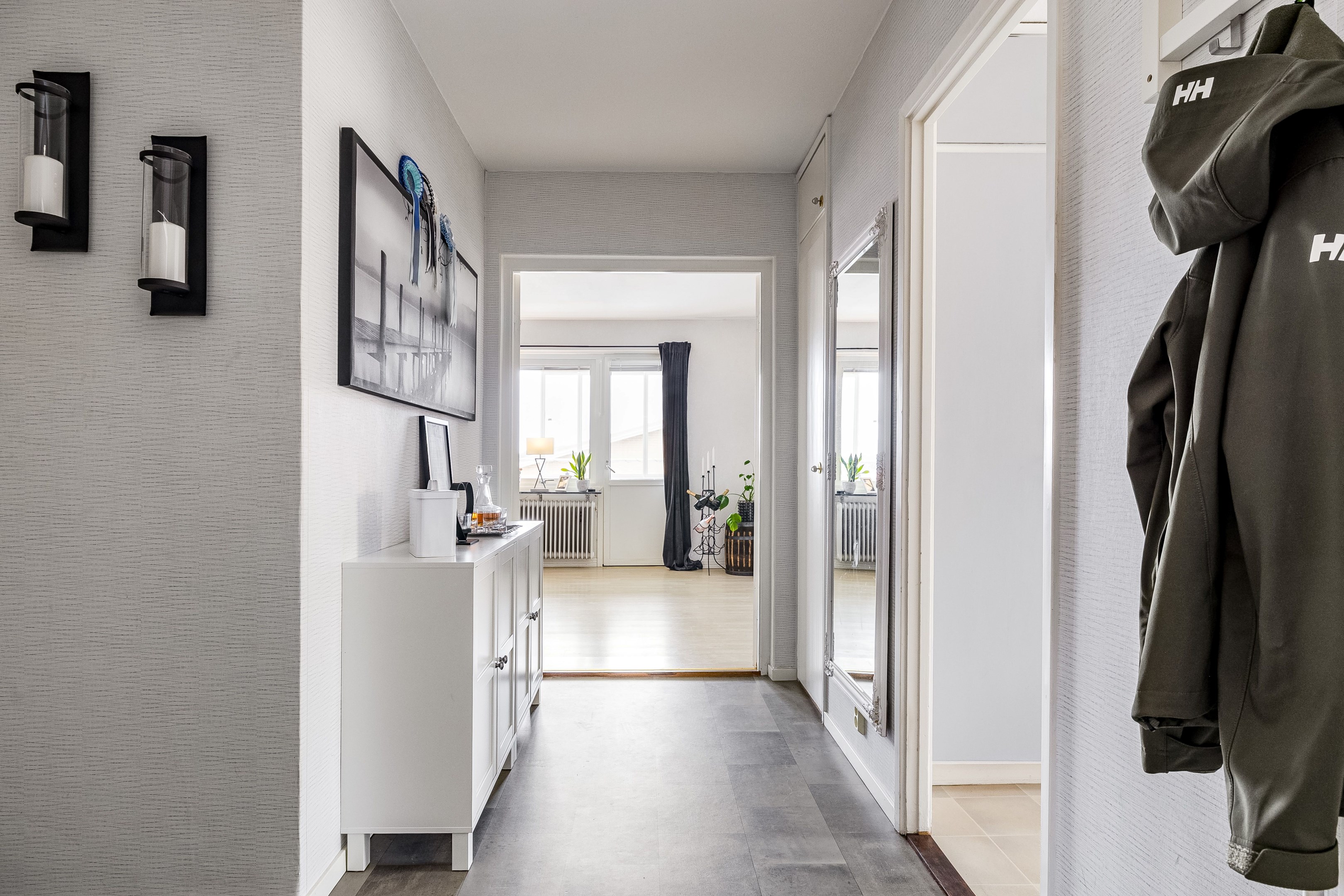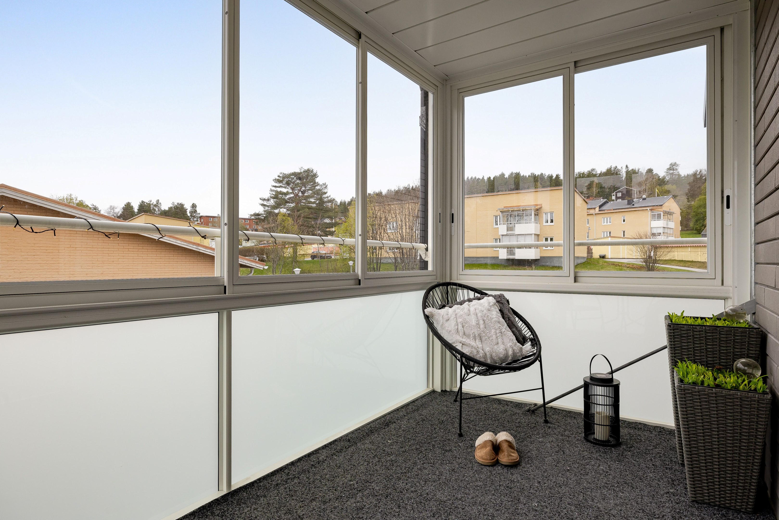 Välkommen in i! Hallen i lägenheten är placerad centralt och till vänster når man sovrummet som har bra med plats för dubbelsäng samt förvaringsmöbler. Intill sovrummet finns även ett förrådsutrymme med bra plats. Badrummet i lägenheten är utrustat med WC, kommod samt dusch med glasdörrar. Till höger från entrén når man köket som har bra storlek och ger en ljus känsla. Vardagsrum i två sektioner där den ena delen kan nyttjas som sovrum om man skulle vilja. I dagsläget är det inrett som utökat vardagsrum med plats för matbord. Från vardagsrummet så når man även lägenhetens inglasade altan med utsikt bort mot Kyrkviken.
