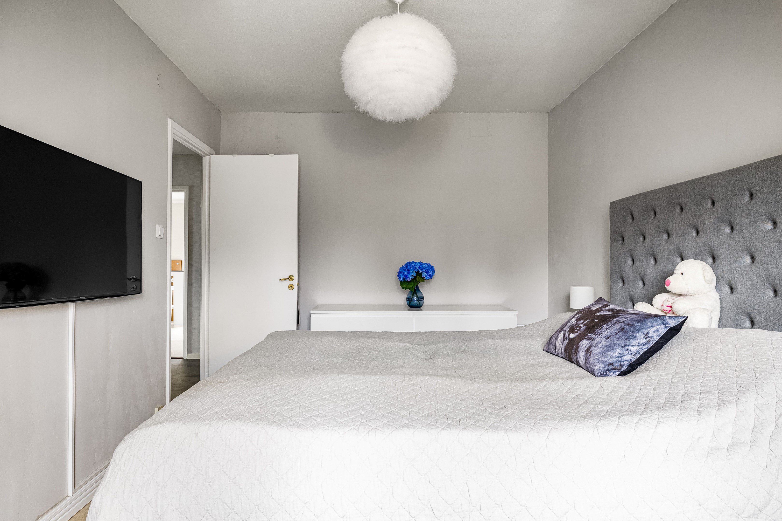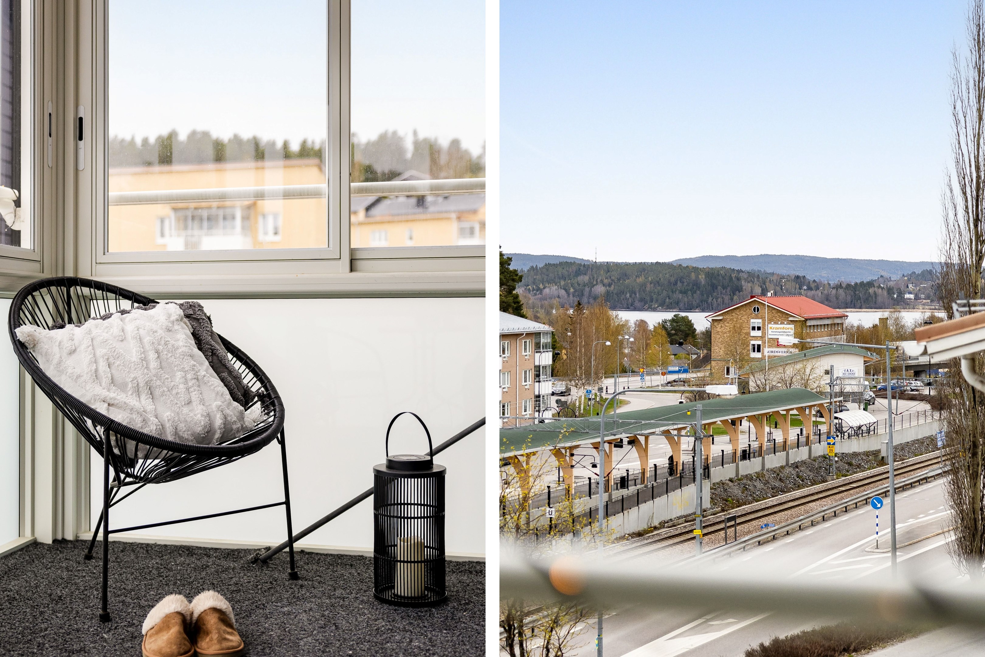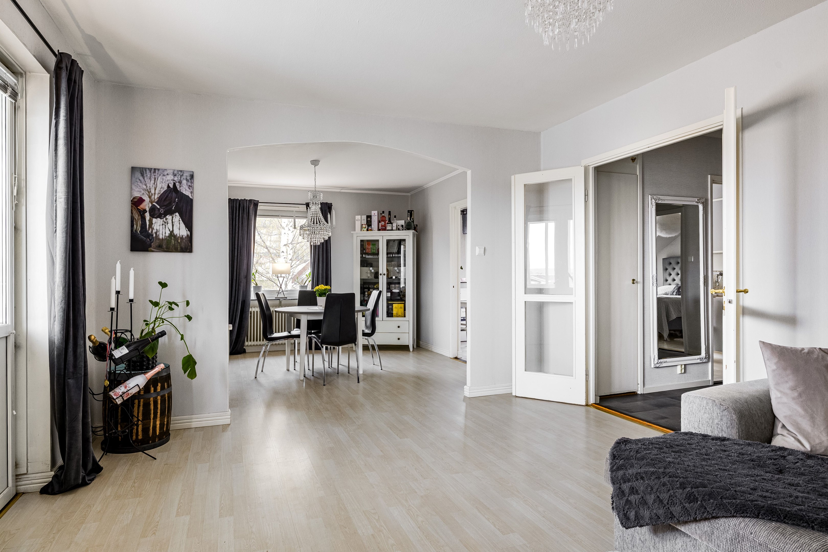 Välkommen in i! Hallen i lägenheten är placerad centralt och till vänster når man sovrummet som har bra med plats för dubbelsäng samt förvaringsmöbler. Intill sovrummet finns även ett förrådsutrymme med bra plats. Badrummet i lägenheten är utrustat med WC, kommod samt dusch med glasdörrar. Till höger från entrén når man köket som har bra storlek och ger en ljus känsla. Vardagsrum i två sektioner där den ena delen kan nyttjas som sovrum om man skulle vilja. I dagsläget är det inrett som utökat vardagsrum med plats för matbord. Från vardagsrummet så når man även lägenhetens inglasade altan med utsikt bort mot Kyrkviken.