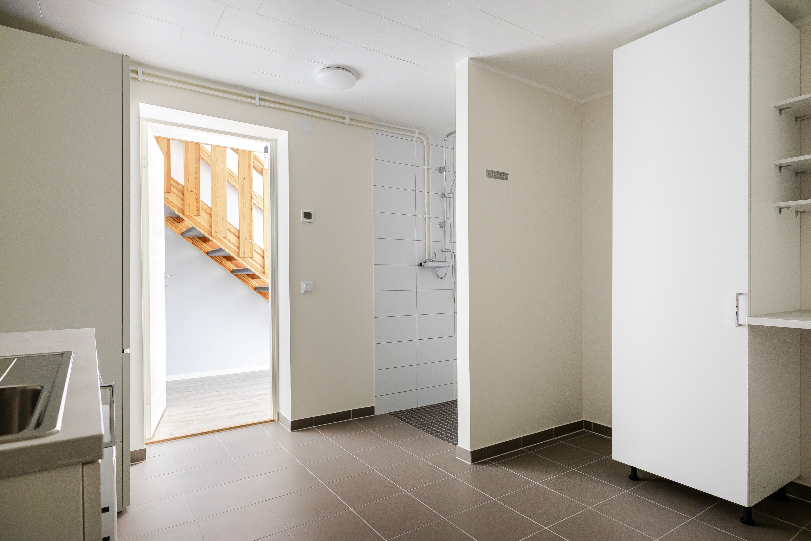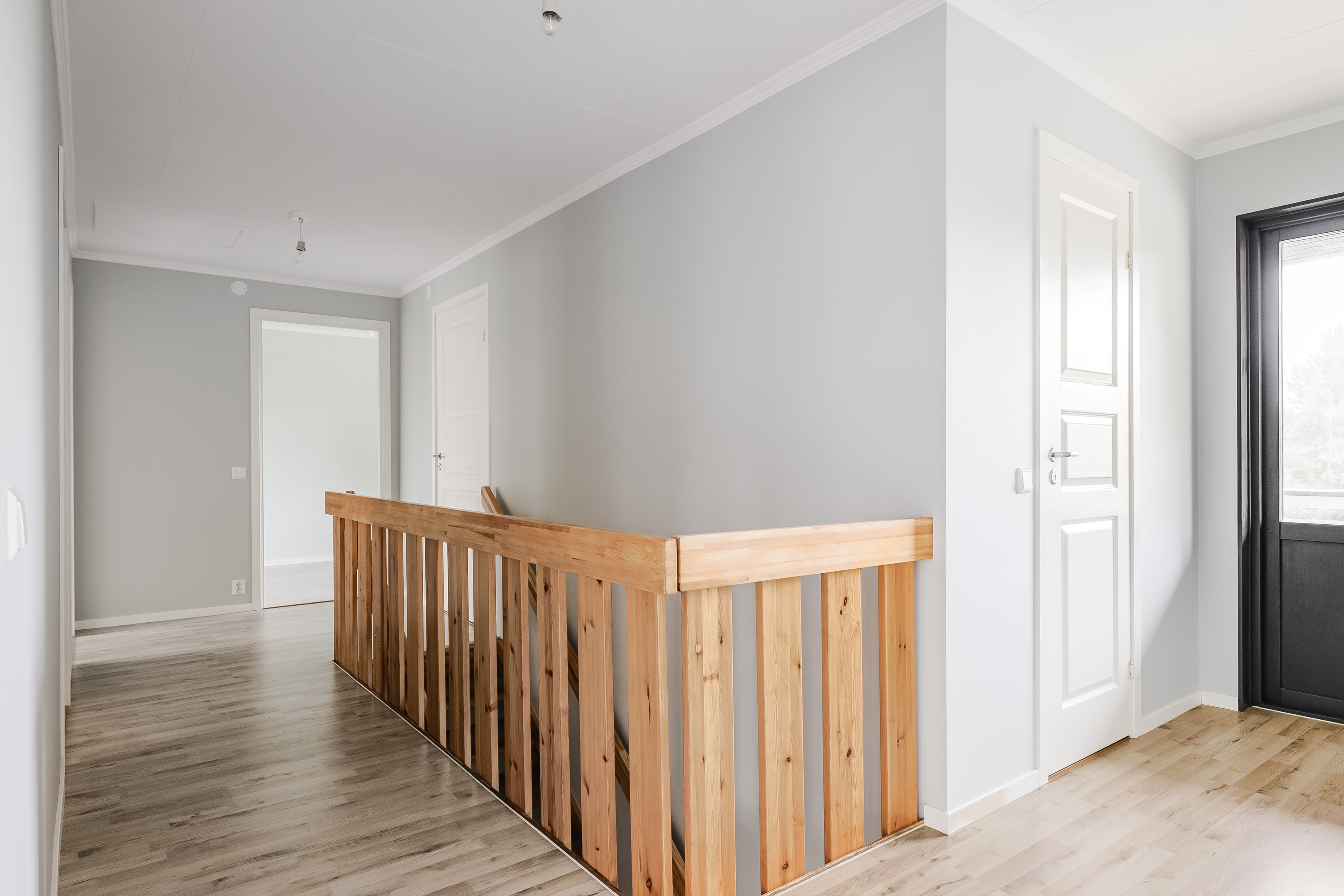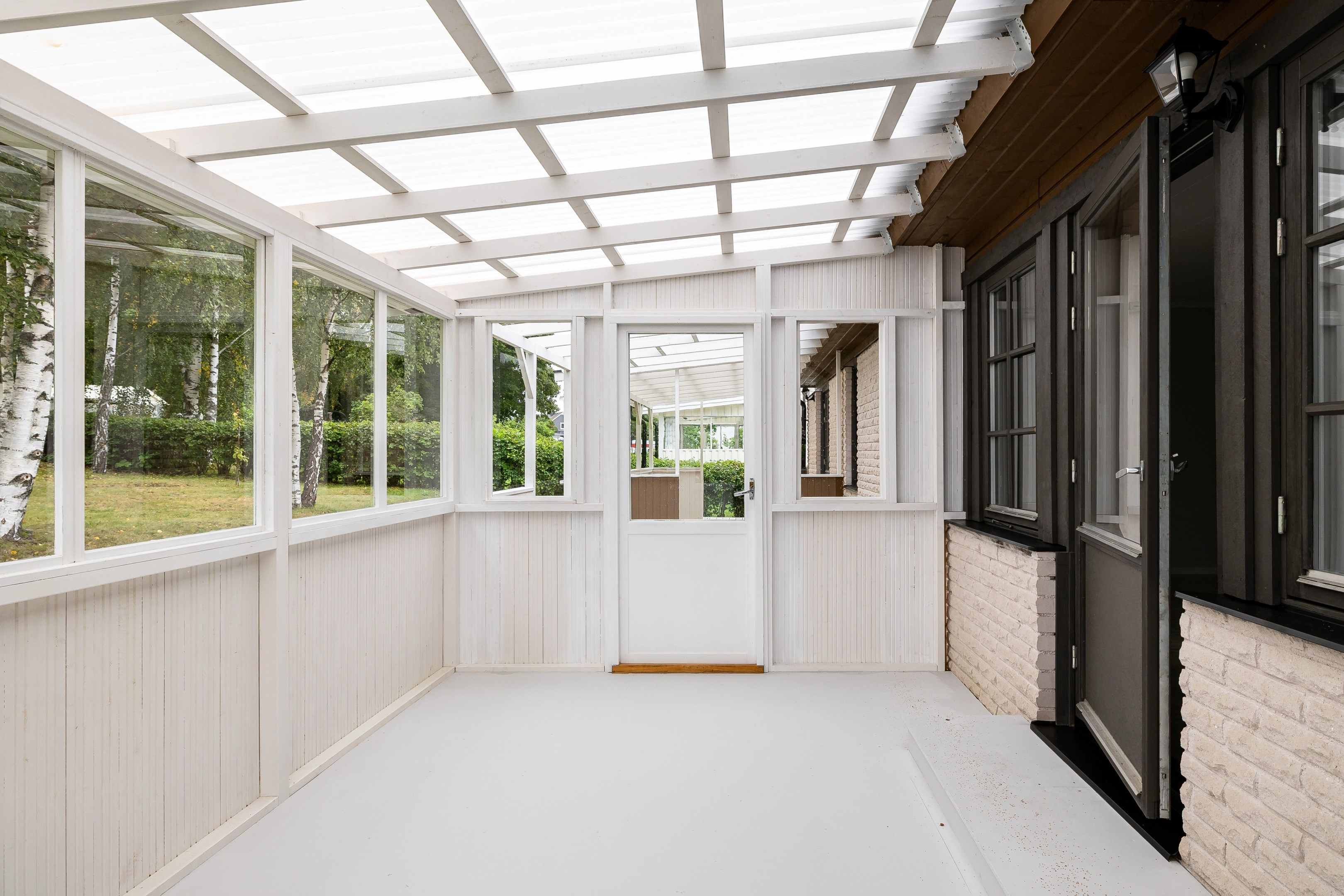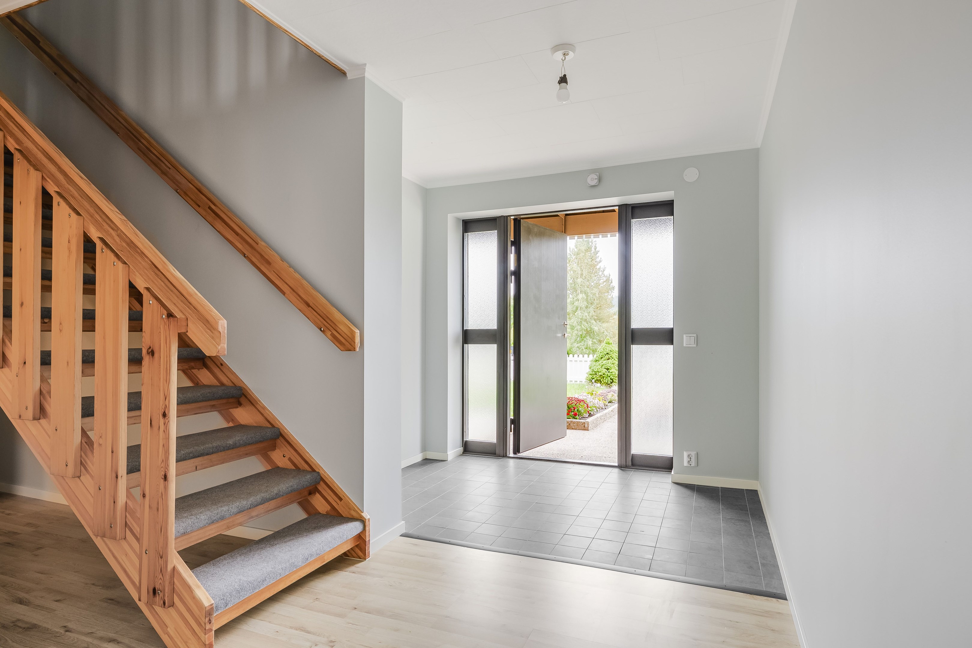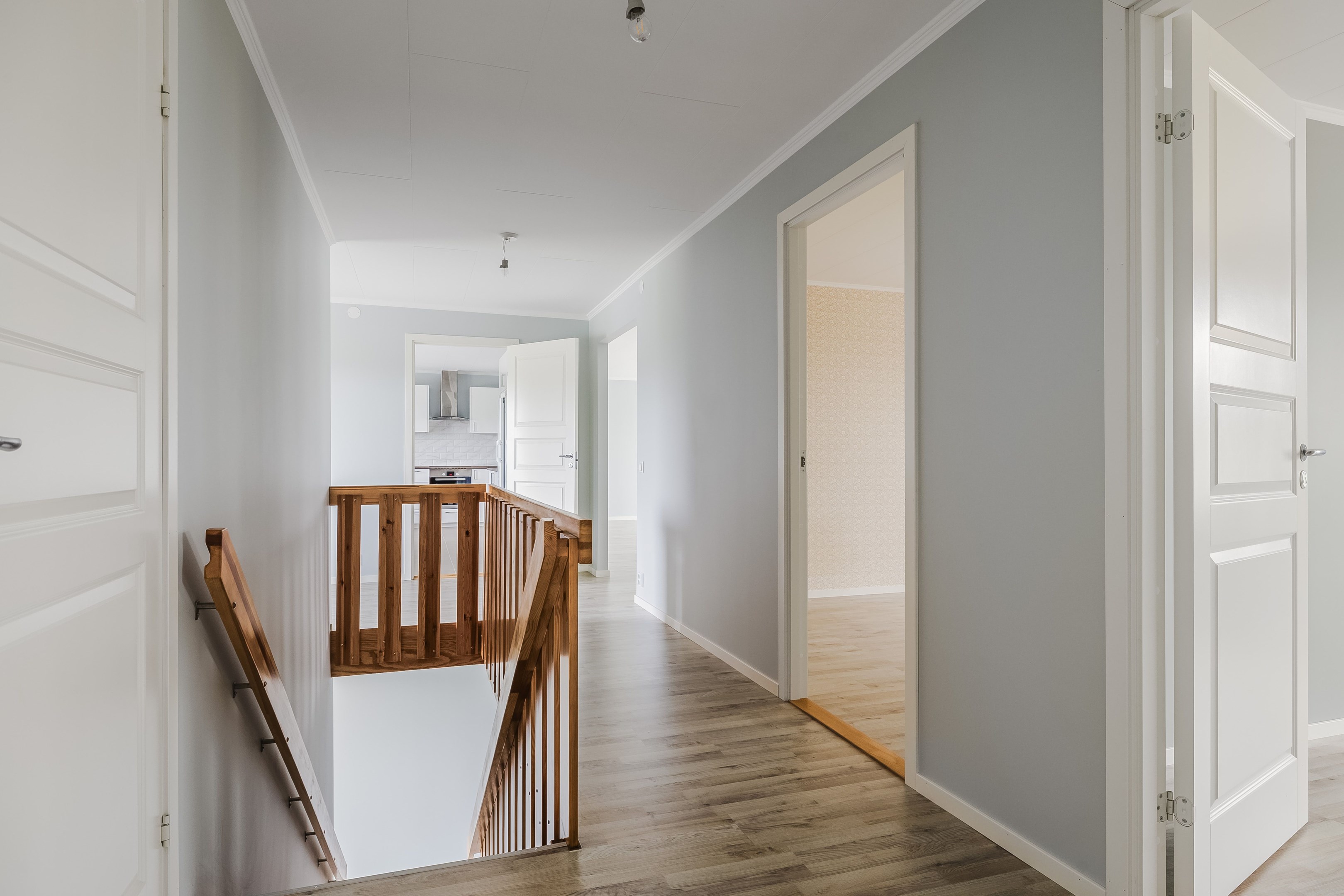 Rymlig entré med WC direkt till höger när man kommer in i huset. vidare in vid entrén kommer man vidare till husets gillestuga där det även finns två sovrum. Samtliga ytor är av ljusa ytskikt och ger en väldigt fräsch och trevlig känsla. på planet finns även husets tvättstuga som även är utrustat med dusch. Från tvättstugan når man vidare till husets garage samt förrådsutrymme. En trappa upp ligger husets kök. Köket är utrustat med Ugn, spishäll, fläkt, diskmaskin, samt kyl och frys. Intill köket ligger husets vardagsrum som även har utgång till den inglasade altanen. Förutom inglasad del får du även en del med tak samt en utan. Övervåningen har totalt tre sovrum där två är något mindre och ett större. intill sovrummen ligger även husets badrum utrustat med wc, handfat, samt badkar. Här inne är det kakel på väggarna och klinker på golven. Tomten runt huset är i etage och på baksidan består ytan till störst del av gräsyta men det finns även ett antal träd. Varmt välkommen på vinsing!