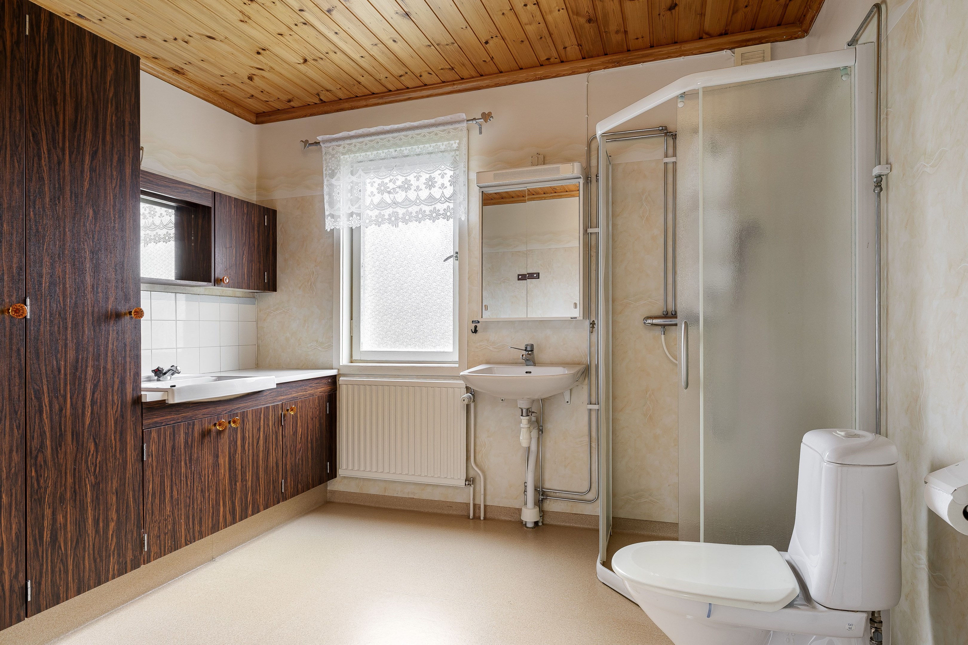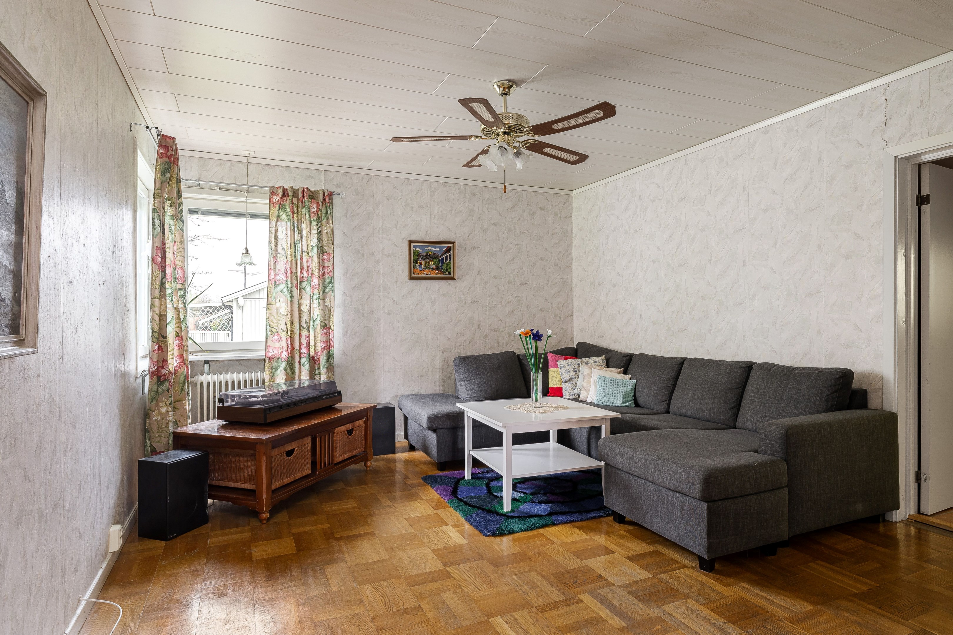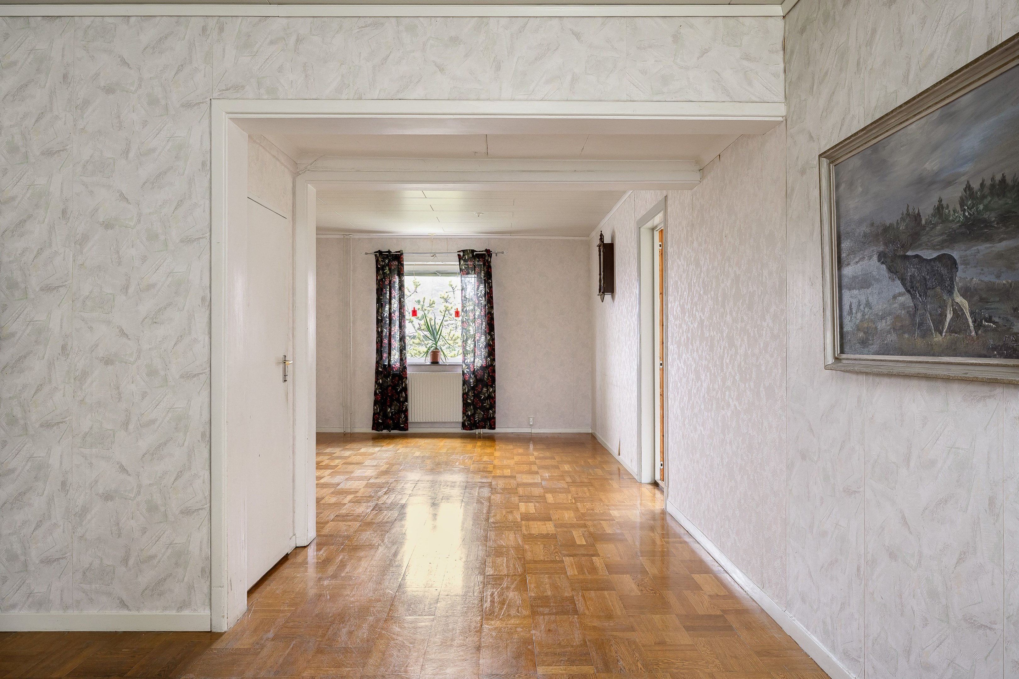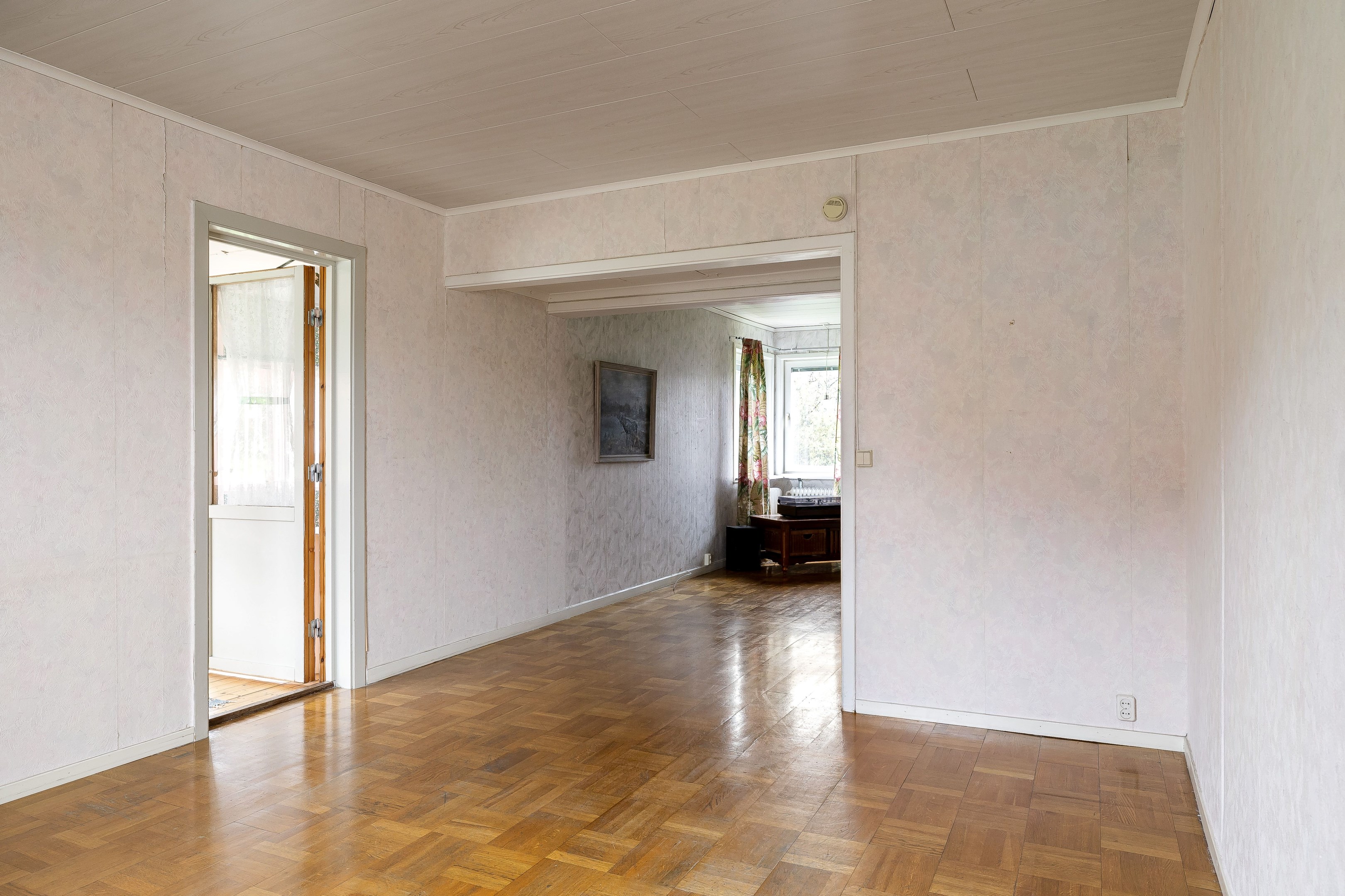 Välkommen in i den rymliga hallen. Här finns plats för ytterkläder samt att hallen leder vidare in till entréplanets alla övriga utrymmen. Direkt till höger ligger husets badrum som är utrustat med wc, kommod, garderober samt dusch. På golv och väggar sitter våtrumsmatta. Till vänster från hallen ligger husets kök som har bra med bänkyta samt plats för matbord. Köket renoverades 2010. Vidare in i huset når vi vardagsrummet som har två rum i fil, det ena utrymmet skulle kunna byggas om till ett extra sovrum. Från vardagsrummet når man även husets inglasade uterum. En trappa upp når vi husets två sovrum som har gott om plats till möblering. På övervåningen finns även mindre wc. Huset har även källare under hela ytan och här nere erbjuds gott om plats till förvaring samt pannrum och en stor tvättstuga! På tomten finns lekstuga, förrådsbyggnad samt garage vid uppfarten. Tomten runt huset är plan och består av gräsmatta och träd och buskar. Varmt välkommen på visning!
